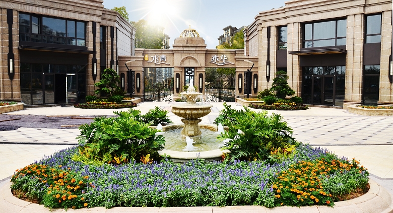 水青木華家園一心一環(huán)兩軸的景觀組團布局,水、綠地、石、亭組成的中心活動廣場,設(shè)置小橋流水、疊泉、流瀑、潛溪的中央戲水景區(qū),定時開放的噴泉和大型塑像,共同構(gòu)建自然柔美的循環(huán)水系景觀。